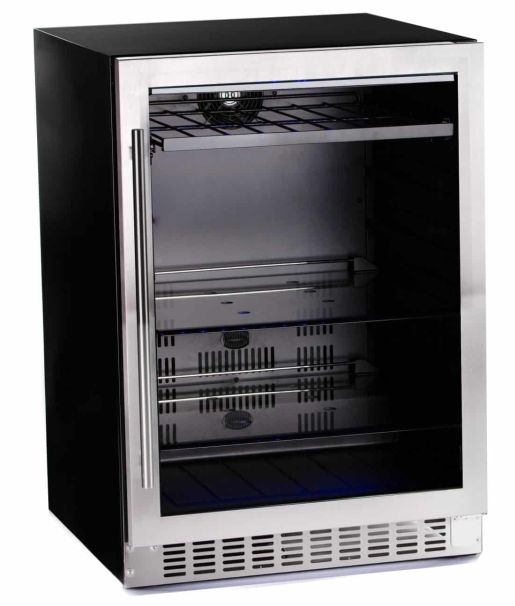 Field reversible door. Dual pane Argon filled glass door to eliminate condensation. Door open alarm. Digital display control. Blue LED interior lighting. 2 adjustable glass shelves. 1 wine rack with black steel front and full extension glidesRead More
